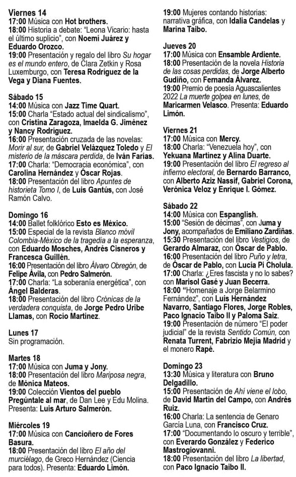 El programa completo de la 13° Feria del Libro en la Alameda Central se puede ver a continuación: