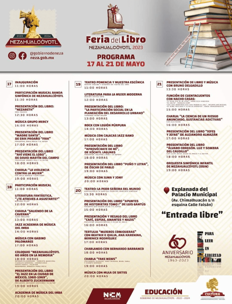 El programa de actividades completo de la Feria del Libro de Nezahualcóyotl 2023 puede verse a continuación: