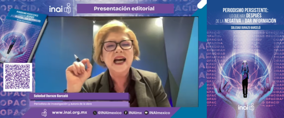 La Comisionada del Instituto Nacional de Transparencia, Acceso a la Información y Protección de Datos Personales (INAI), Norma Julieta del Río Venegas, el Secretario Ejecutivo del Sistema Nacional de Transparencia, Sergio Octavio Contreras Padilla, el Presidente del Foro Nacional de Periodistas y Comunicadores, Rafael Cano Franco, y la periodista mexicana de investigación Sandra Romandía presentaron el libro Periodismo persistente: Lo que hay después de la negativa a dar información de la reportera de México Soledad Durazo.